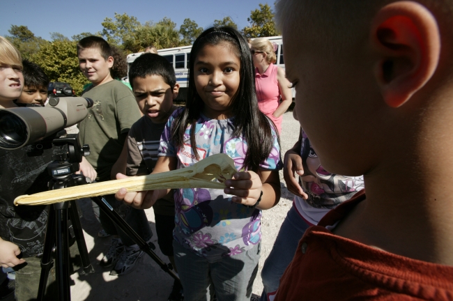 This girl is uncertain if she wants to be holding the skull of a pelican but is happy to learn about it anyway.