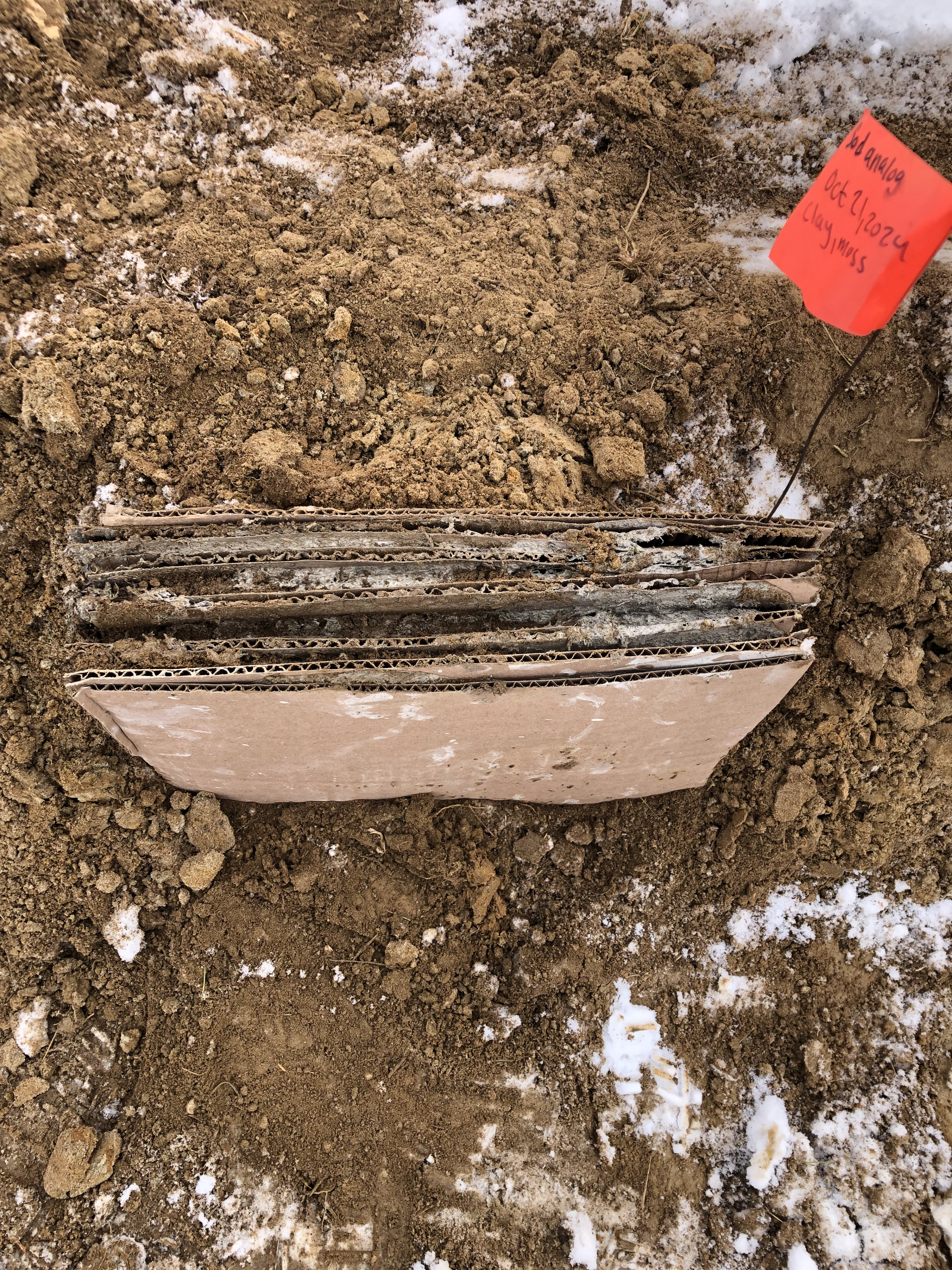 A sod analog block made of a moss slurry sandwiched between sheets of cardboard, that is half buried in the ground. The goal is to develop a product that will thermoregulate, is simple to construct and transport, and will act as an ecological replacement.