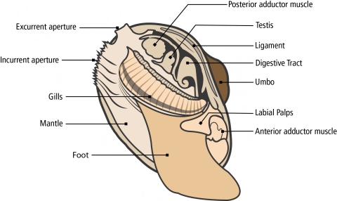 Soft tissue anatomy of a freshwater mussel. Graphic: Kristen Simanek, USFWS.