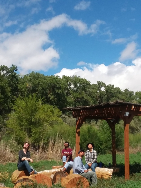 Members of Albuquerque's Outdoor Afro group sits at Valle de Oro's outdoor classroom to watch the solar eclipse.