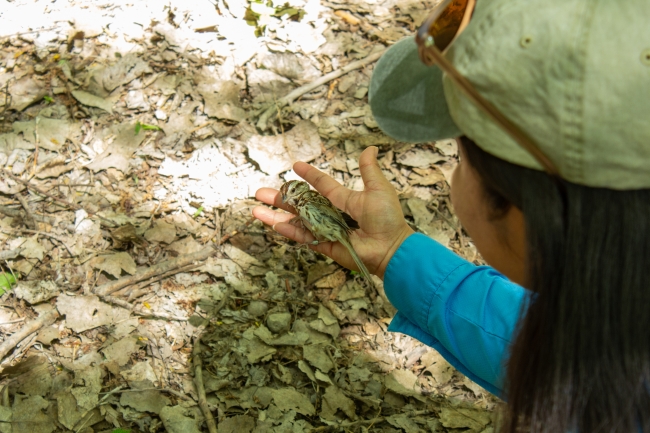 A song sparrow is released after being captured in a mist net and given a uniquely numbered identification band. The bird is released in an open hand and allowed to fly away.