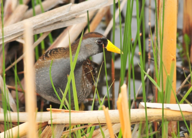 The Sora is a small and secretive bird found on both Cokeville Meadows and Seedskadee NWRs. It prefers the oxbow wetlands and developed wetland units on the Refuges. Its distinctive descending whinny call is commonly heard, but actually seeing the little marsh-walker is much more difficult.