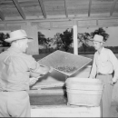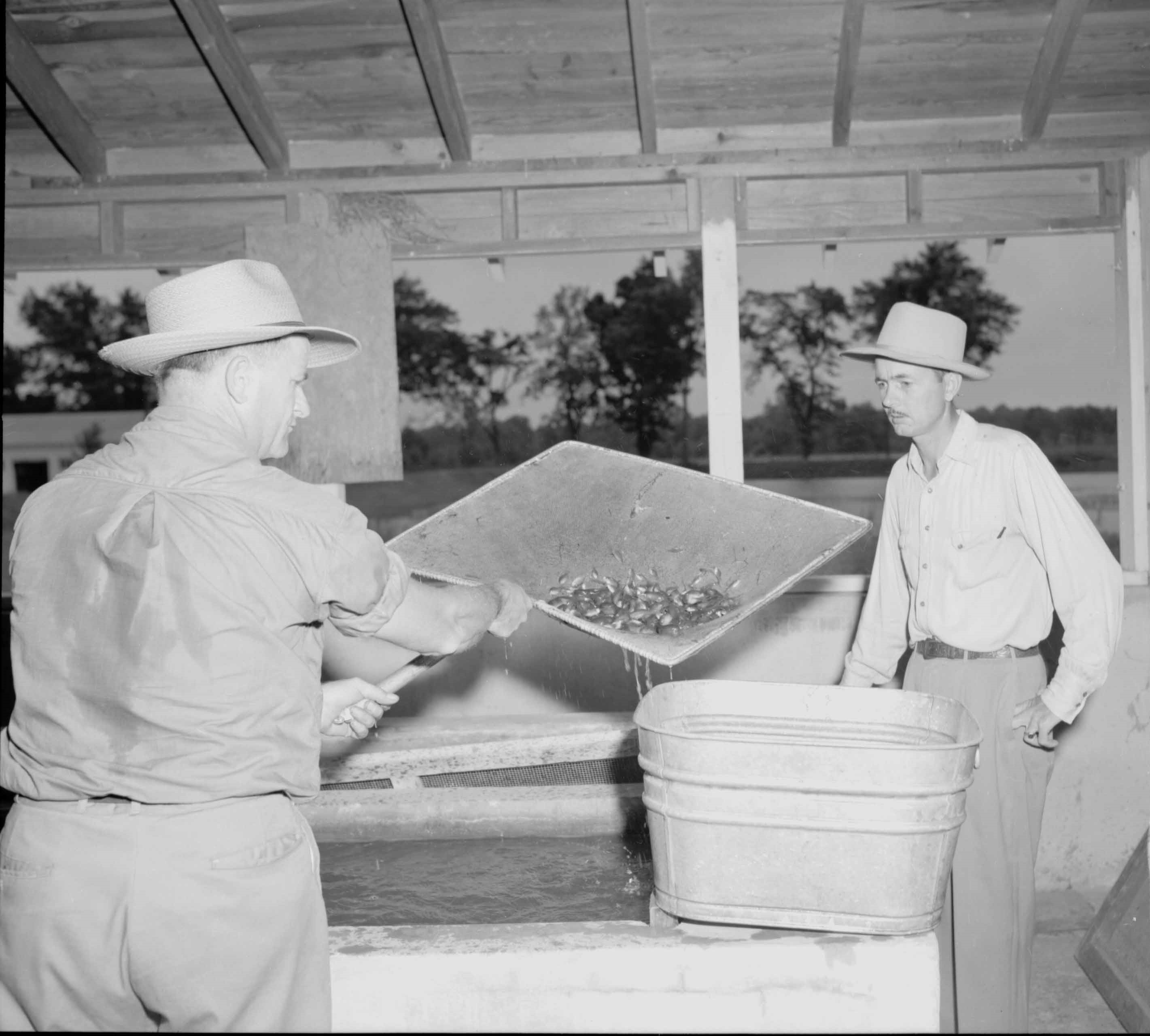 Original caption: Sorting apparatus being used to sort Bluegills at the hatchery. Personnel: Glenn F. Adams, foreman, and H.C. Topel, hatchery Superintendent. Tishomingo National Fish Hatchery, Oklahoma, May 1949.