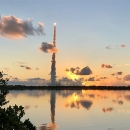 A rocket launches up to space in the golden dawn light from Cape Canaveral.