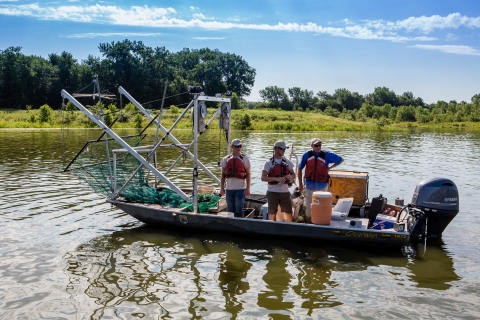 Specialized carp catching boat with dozer trawl in the Illinois River.