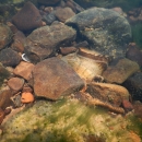 A speckled pocketbook mussel is between rocks in the South Fork tributary of Little Red River, Arkansas, May 12, 2022.