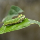 Closeup of a spicebush swallowtail butterfly larva on a spicebush leaf.