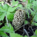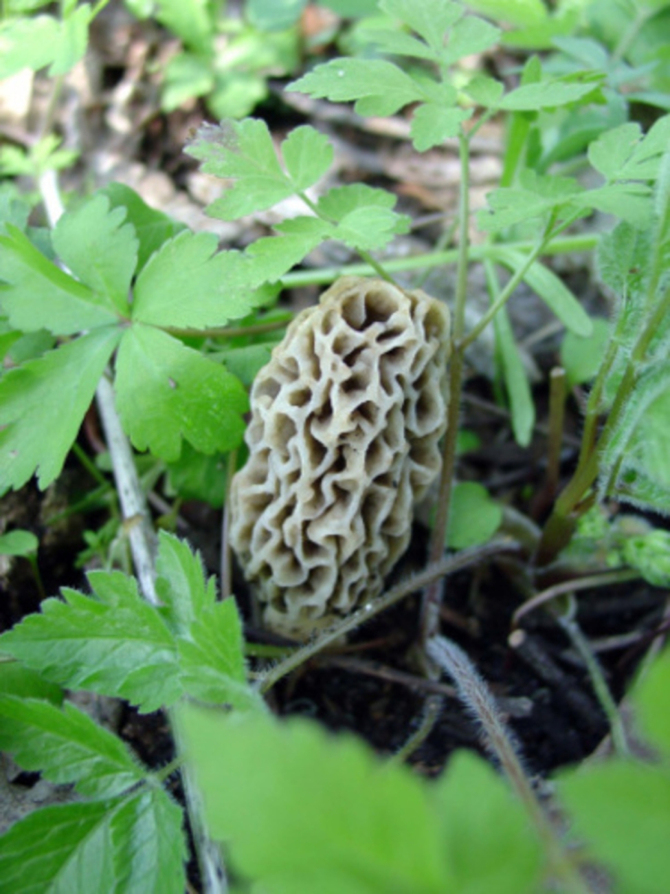 Close-up of a Sponge mushroom growing in green leaves; shows the pits and ridges of the cap; also known as Morel mushrooms or Morille mushrooms.