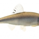 Spotfin shiners are silver-blue in color with a darker back and lighter cream colored belly. They are flat side to side and have a distinctive diamond shaped crosshatching pattern on the sides with dark scale edges.