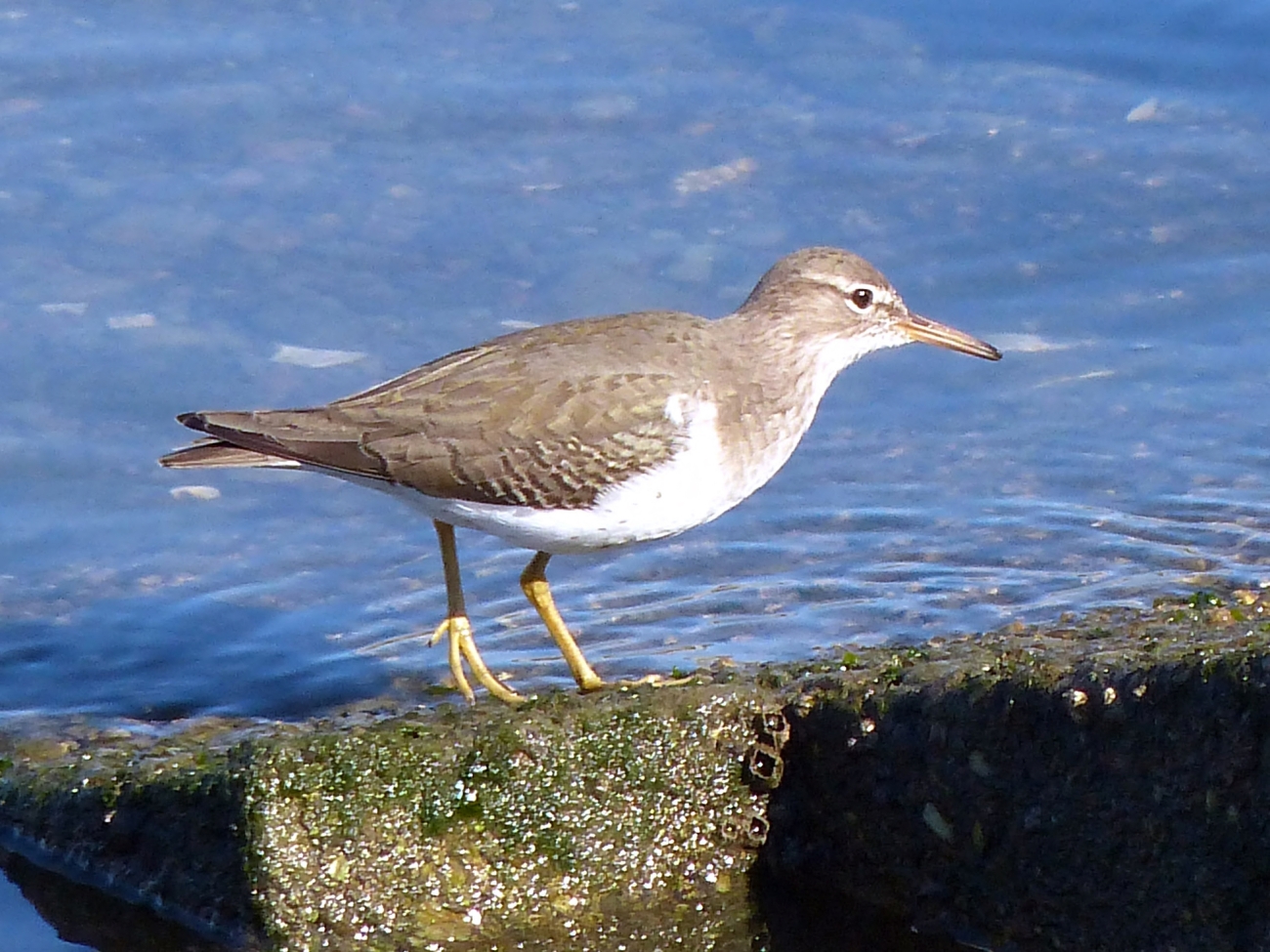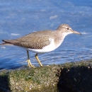 The Spotted Sandpiper is a medium-sized shorebird with a bill slightly shorter than its head and a body that tapers to a longish tail. They have a rounded breast and usually appear as though they are leaning forward.