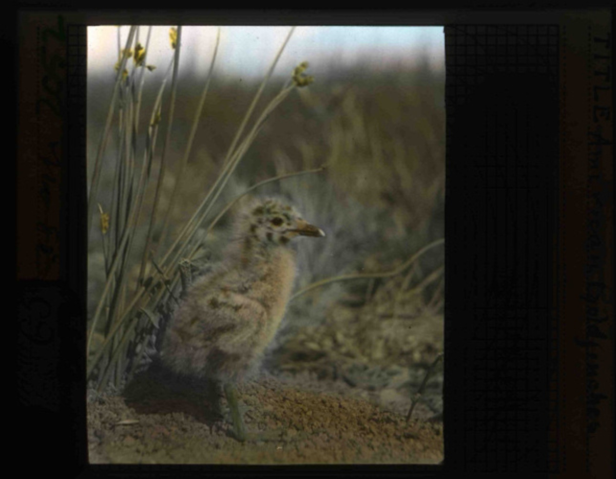 A young spotted sandpiper hand painted glass slide taken by Finley and Bohlman at Klamath Marsh in 1905. These photographs would later help create a bird refuge to protect Klamath from plume hunters in 1908.