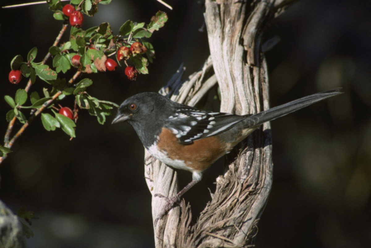Close-up of bird sitting on dead branch with red berries nearby located on Hill Road.