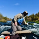Fisheries technician Andreas Raisch of the Lodi Fish and Wildlife Office maneuvers a boat through the San Joaquin River during a search for spring-run Chinook salmon redds, or nests, to monitor spawning activity.