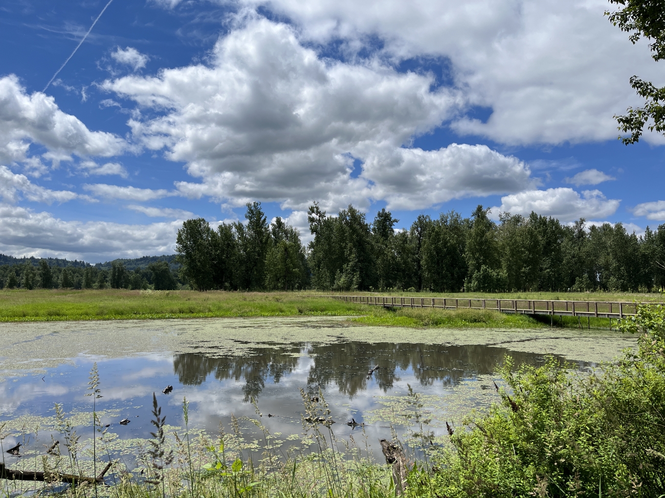 Pond waters with resting turtles reflect the blue sky and white clouds above, with a footbridge and woodlands in the distance, at Steigerwald Lake National Wildlife Refuge in southwest Washington, June 20, 2022. USFWS photo: Toshio Suzuki