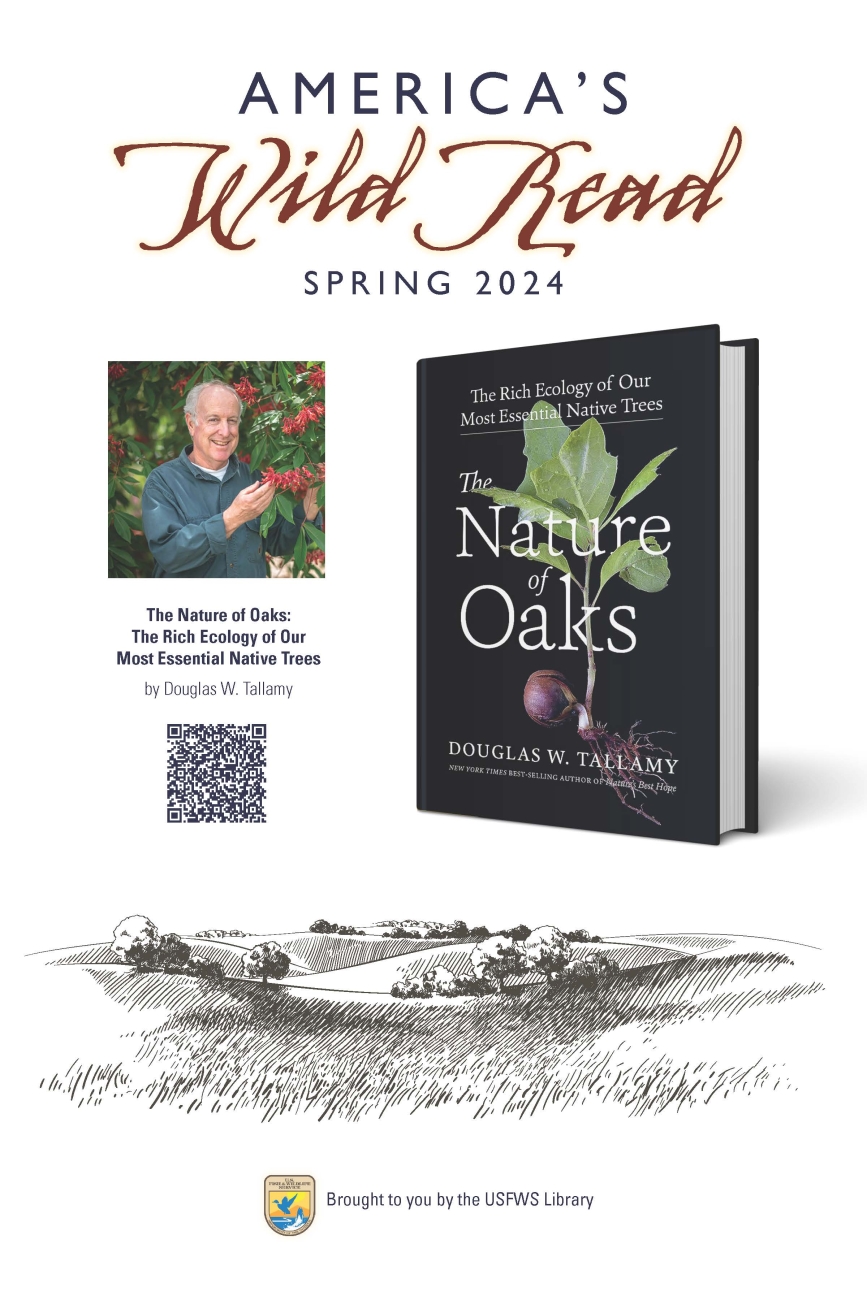 Poster for America’s Wild Read Spring 2024 with head and shoulders image of author and image of book cover for The Nature of Oaks. Graphics: John Embrey/USFWS