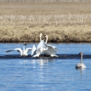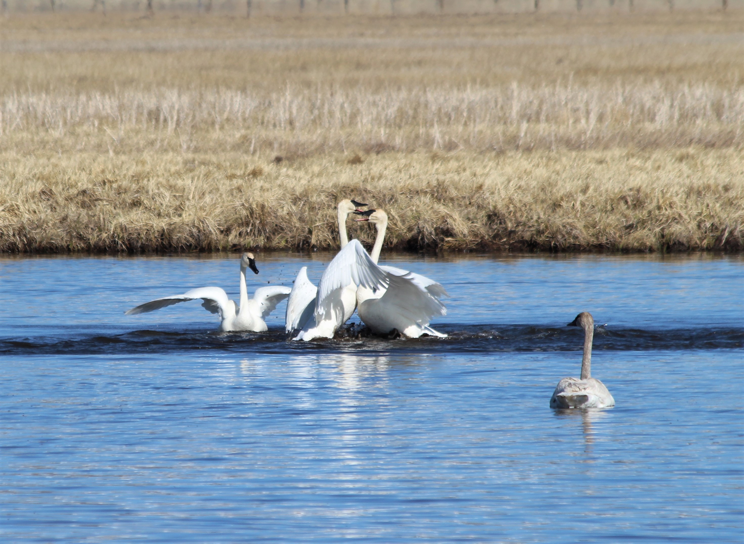 A group of three adult trumpeter swans displaying aggressive behavior as a juvenile cygnet swan watches at Red Rock Lakes National Wildlife Refuge. Photo by Cortez Rohr/USFWS.