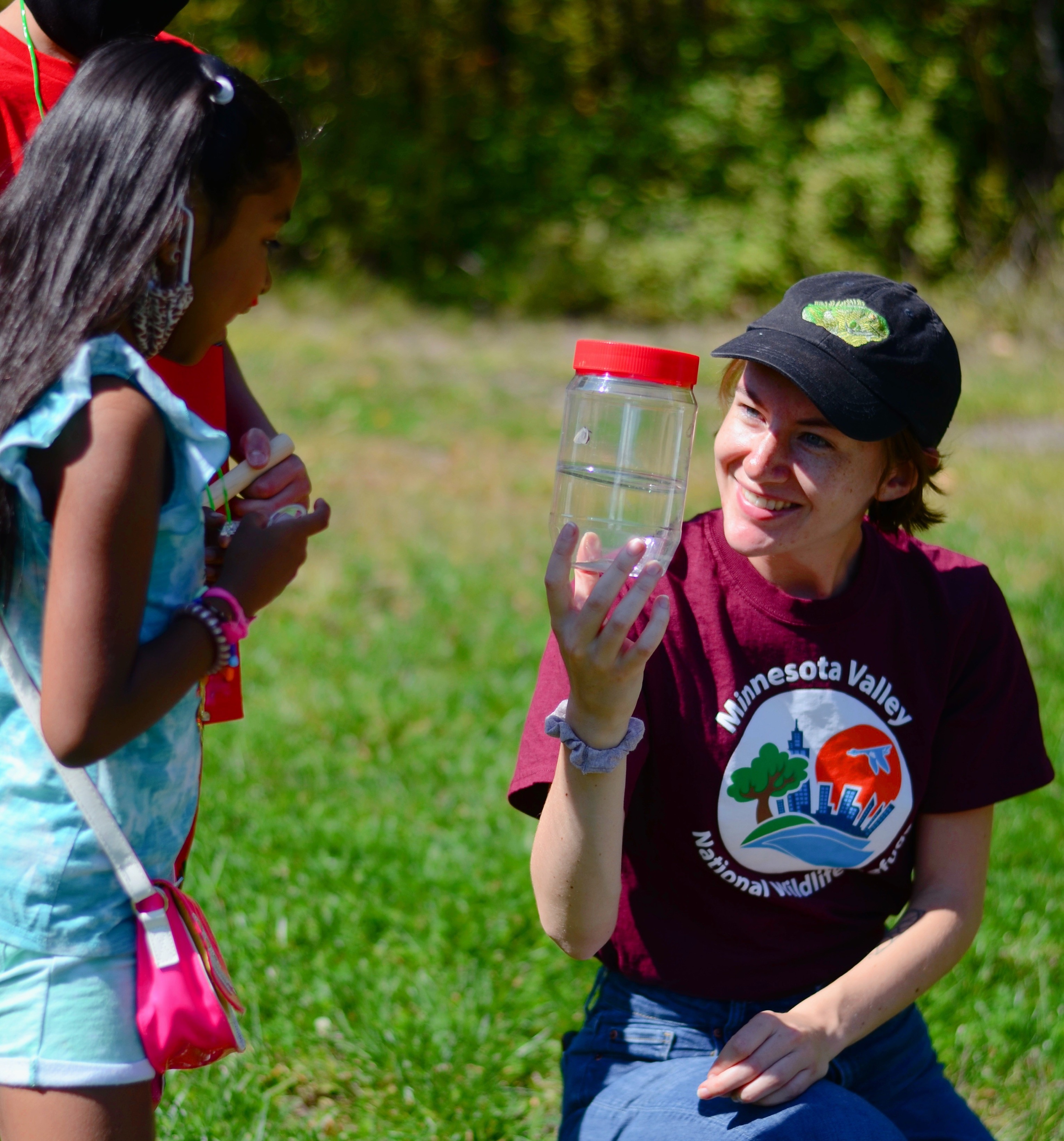 A practicum teaching intern at Minnesota Valley National Wildlife Refuge shows youth an insect at an event held at Hyland Park.