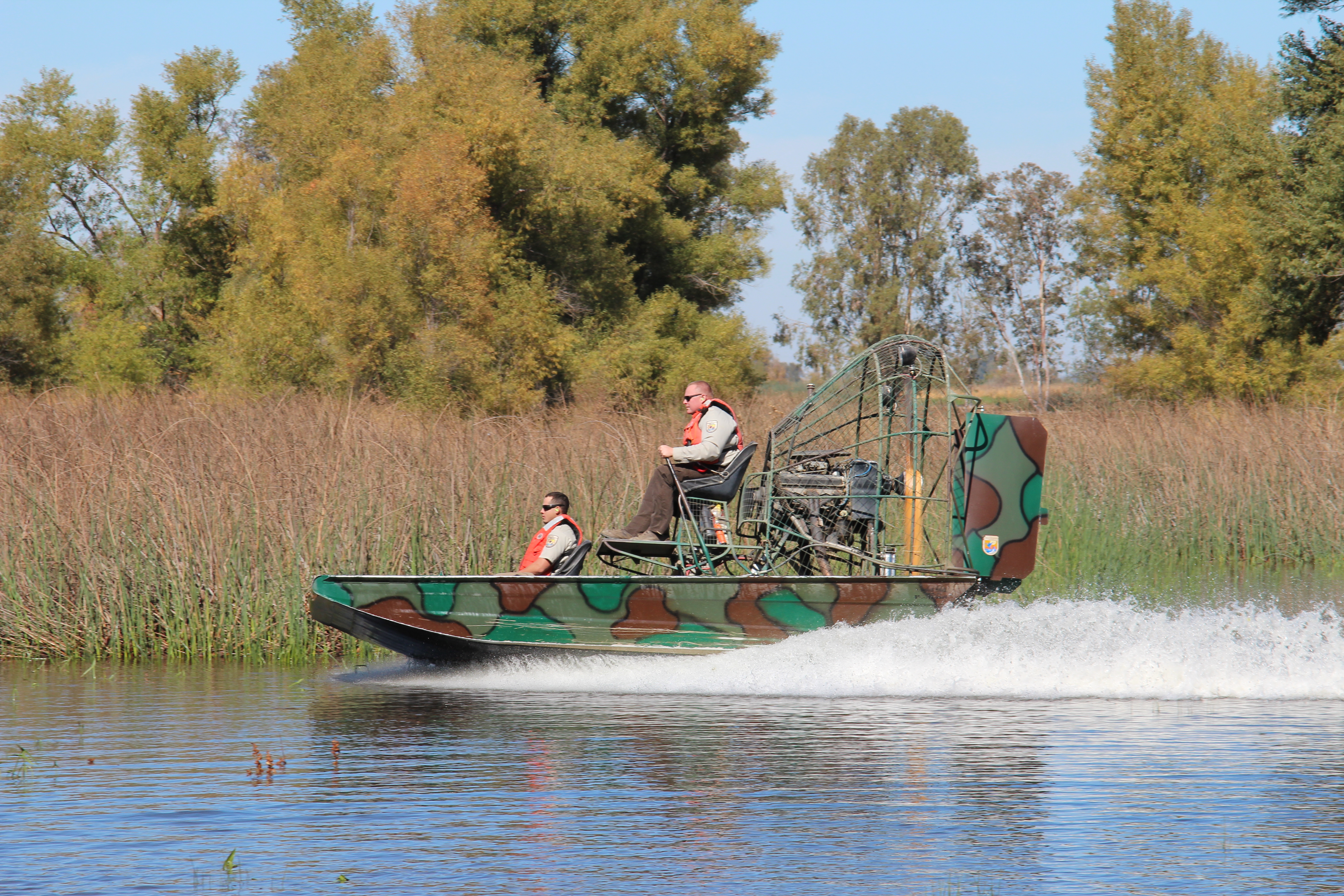 Staff operating an airboat at Sacramento National Wildlife Refuge Complex