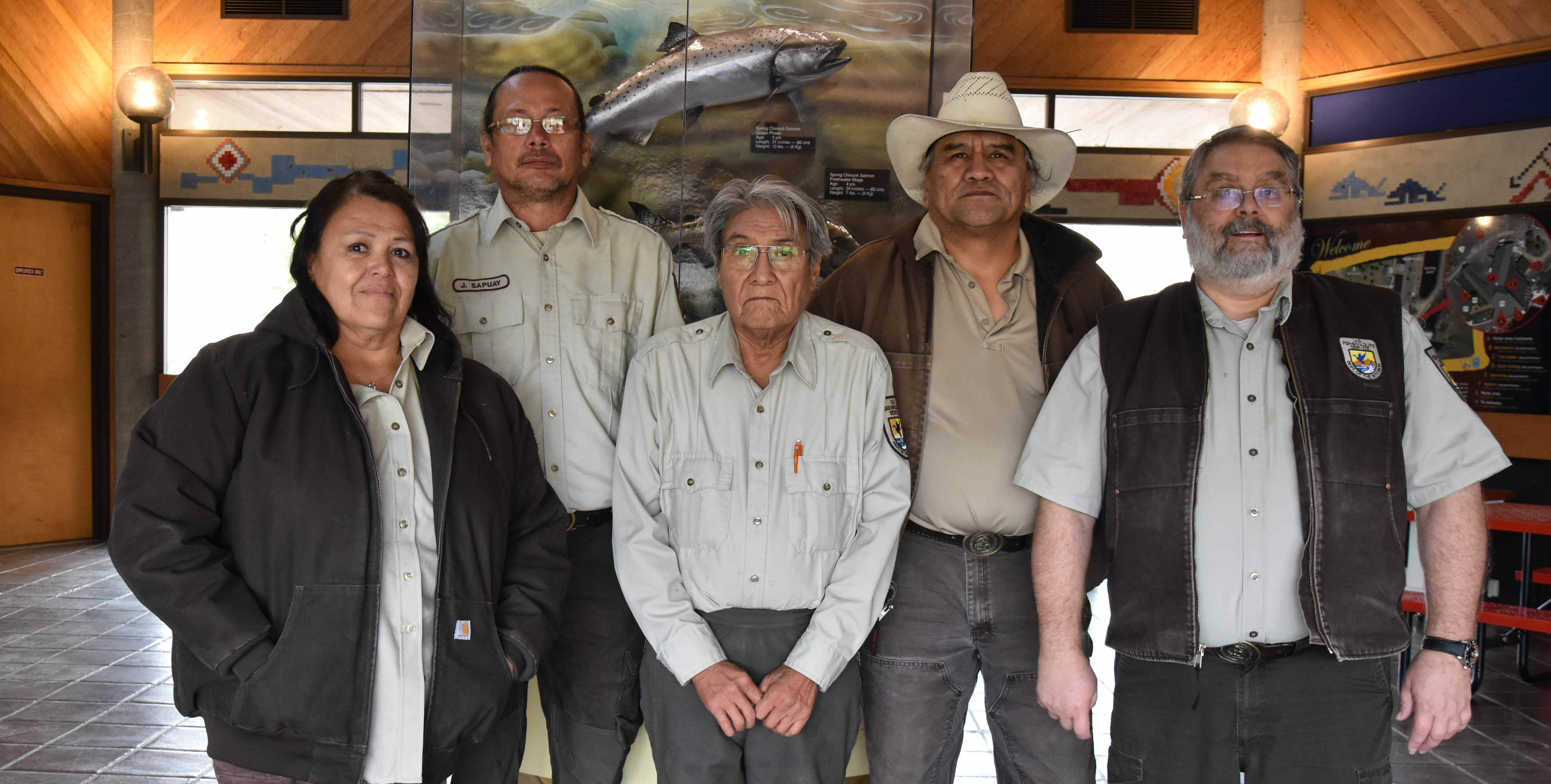 Employees at Warm Springs National Fish Hatchery in Oregon. From left to right: Andrea Supuay, James Sapuay, Joe Badoni, Kevin Blueback, and Terry Freije