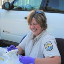 Staff wipe fish health inspection bacteria samples in vile at La Crosse Fish Health Center