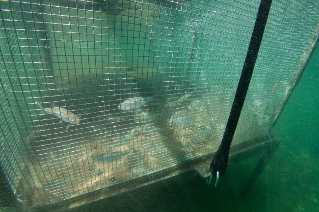 An underwater photograph of the standing cages at Genoa National Fish Hatchery (Genoa, WI). In this case, the metal legs keep the cage off the bottom of the pond. Photo: Ryan Hagerty, USFWS.