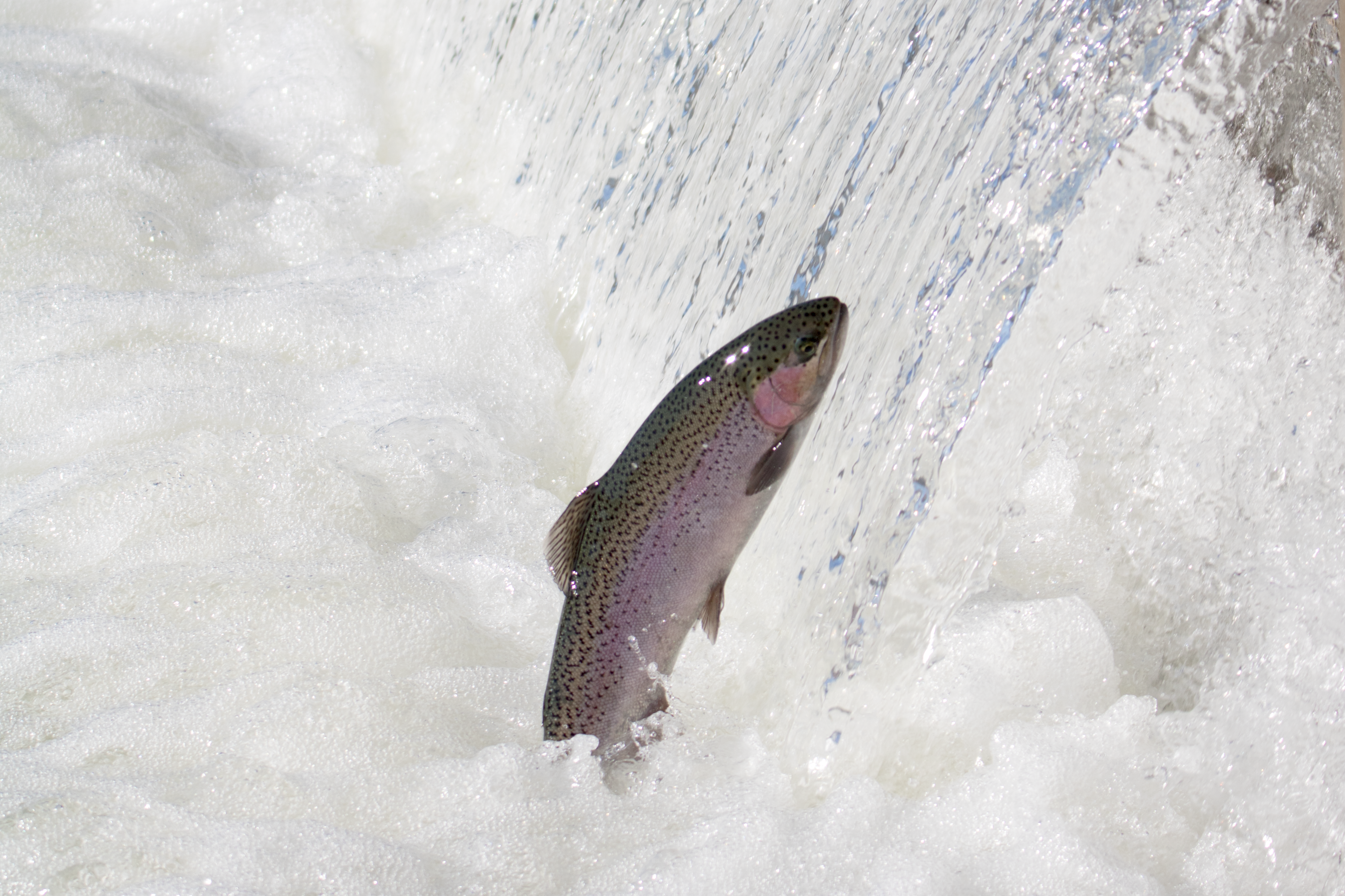 An adult steelhead jumps out of the water at the Coleman National Fish Hatchery.