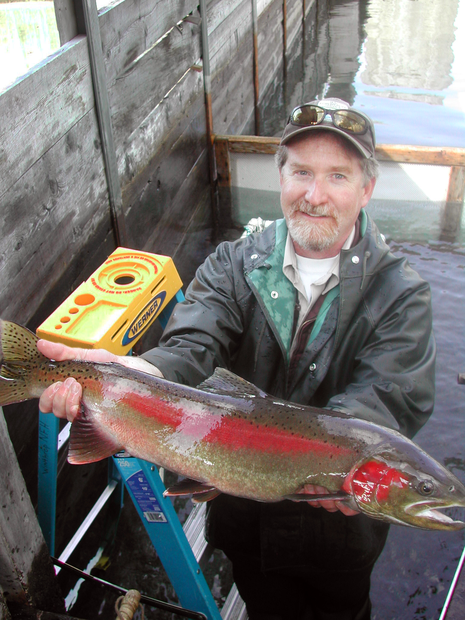 Winthrop National Fish Hatchery's manager, Chris Pasley, holds up a gorgeous steelhead in brilliant spawning colors.