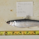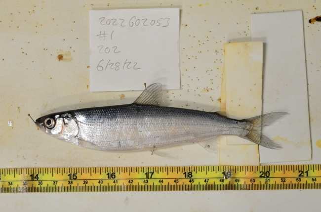 A juvenile hatchery stocked Cisco (Coregonus artedi) that was recaptured in a beach seine in Saginaw Bay. The fish was collected during spring surveys in 2022. Sampling was conducted for the Cisco Stocking Evaluation Plan.