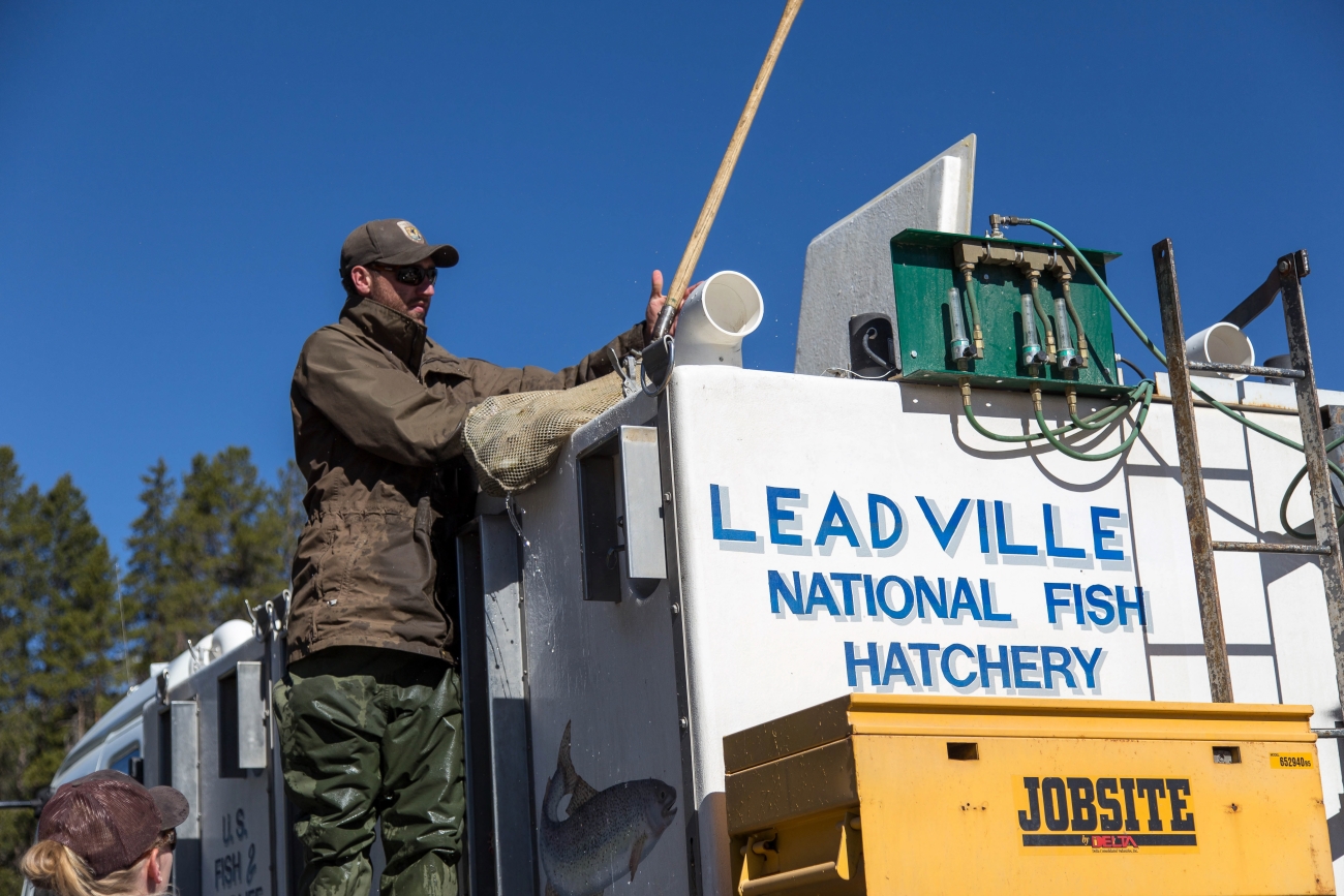 Stocking fish to replenish at Leadville National Fish Hatchery.