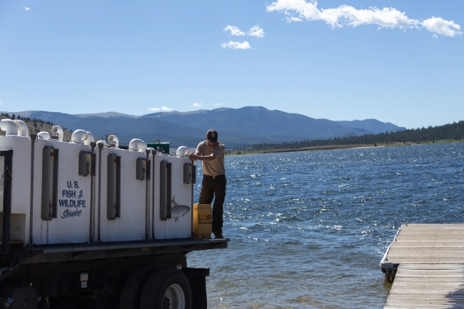 USFWS employee stocking fish for Leadville National Fish Hatchery.