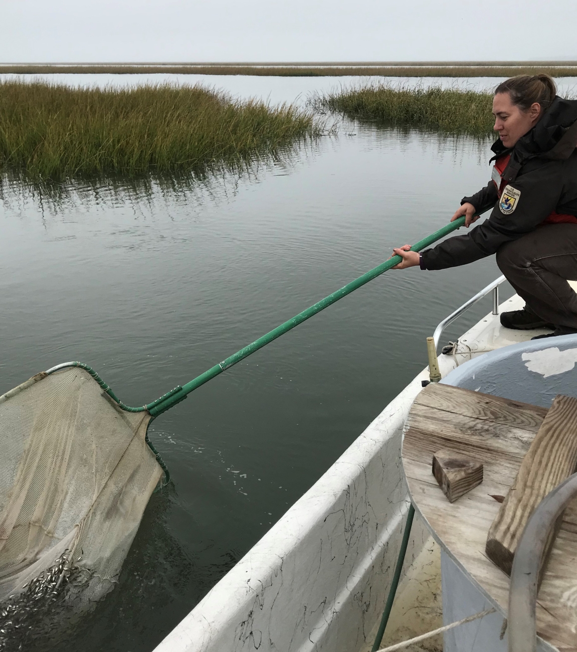 Biologist releasing a batch of small red drum in the grassy areas of the salt marsh.