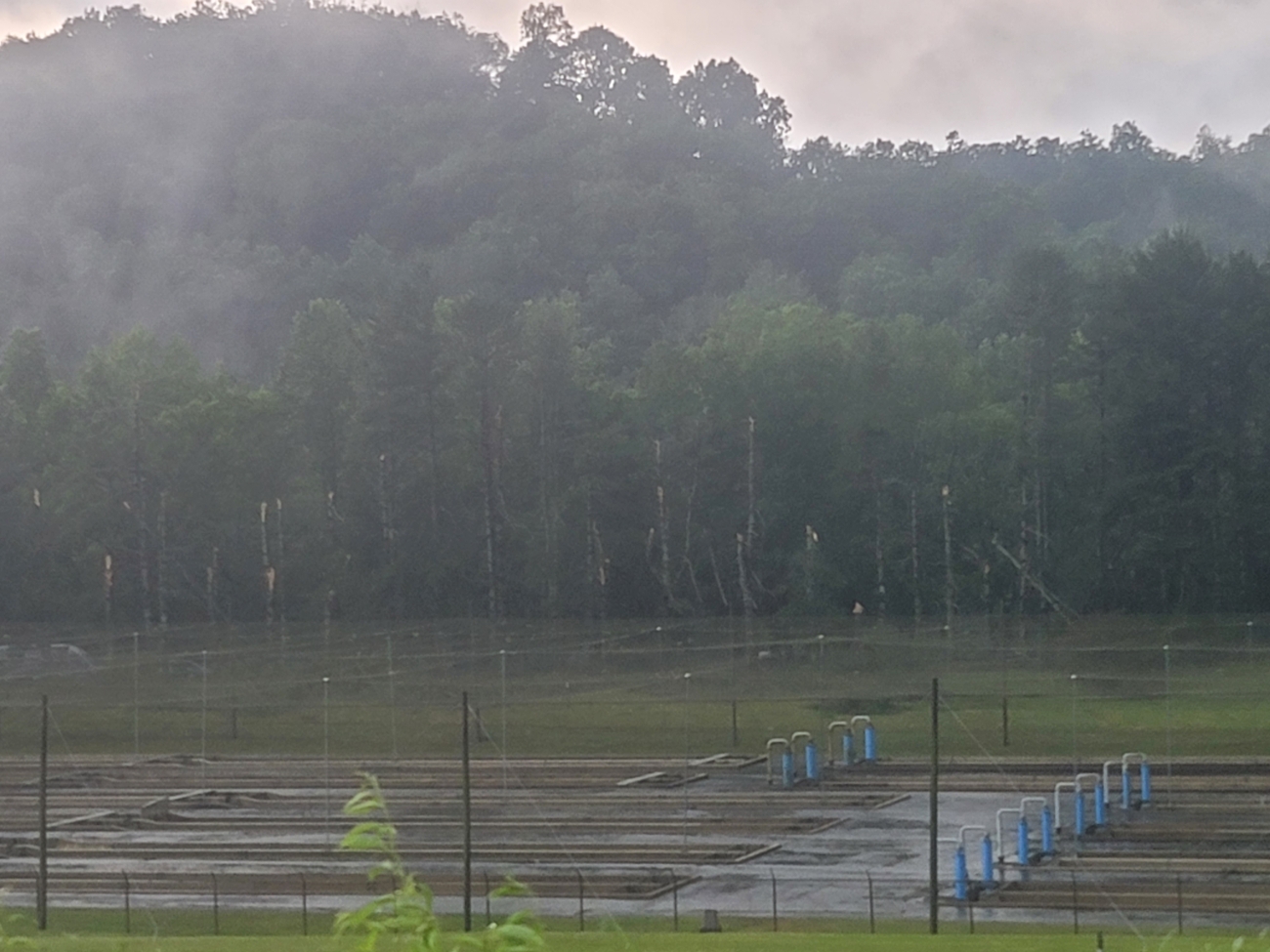 The storm winds entered the hatchery along the southern fence with a path of tree destruction along a clear wind path