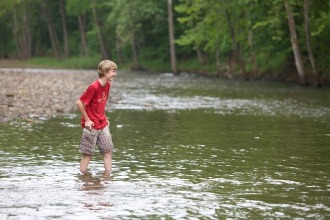 School children test water quality chemistry/survey macroinvertebrates at Seneca Rocks, WV.