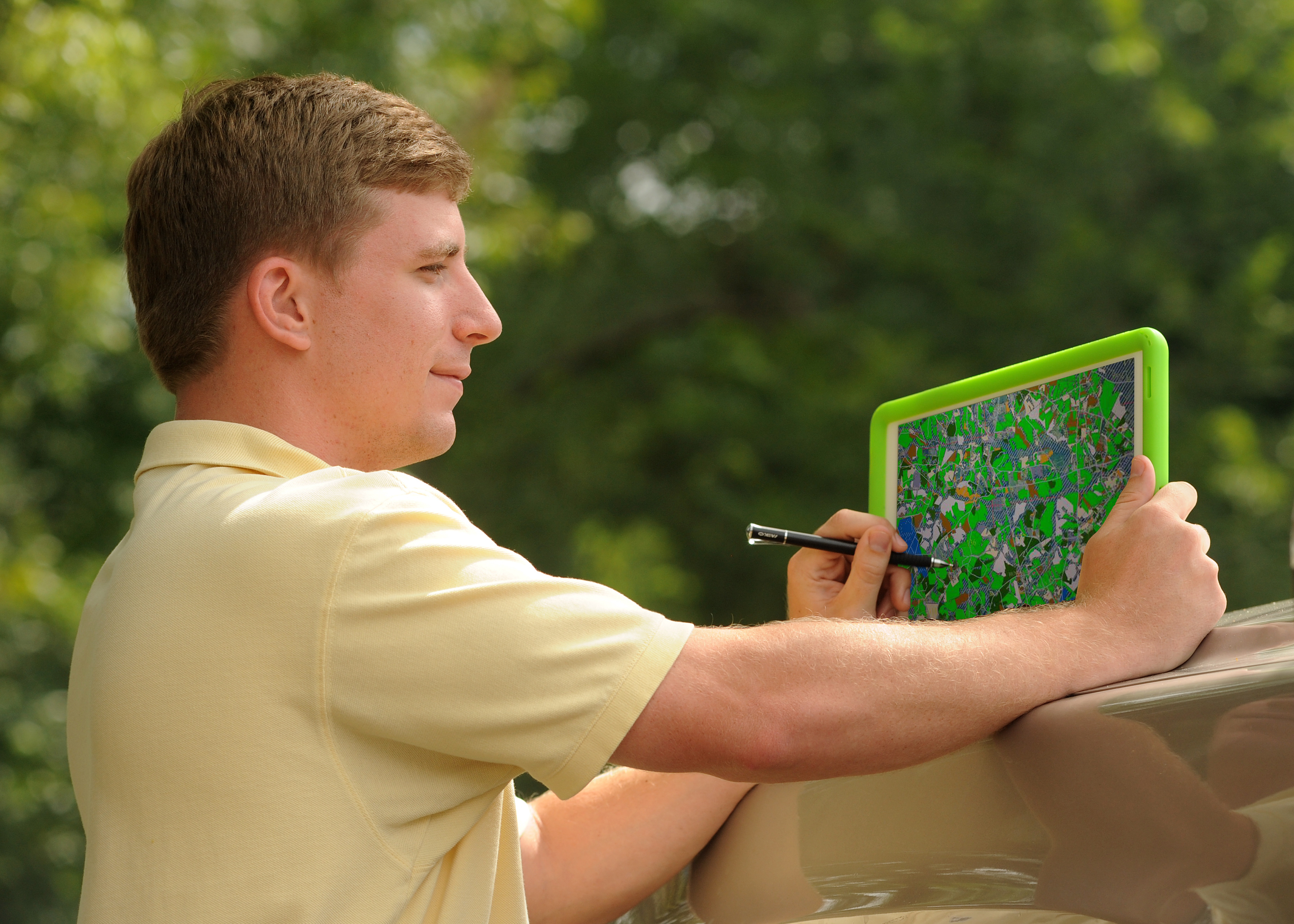 Dylan Whaley, a student intern, collects survey data.
