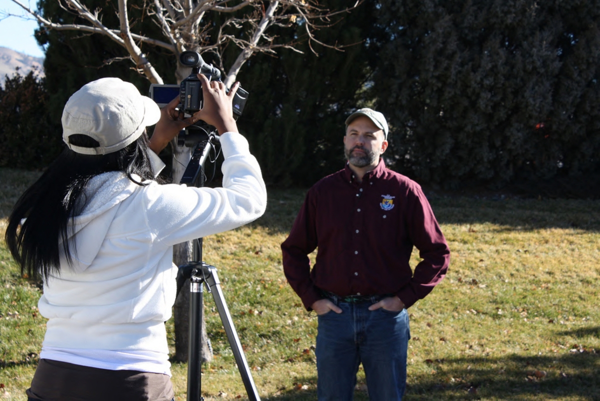 Student Kanisha Allen interviews biologist Roy Averill-Murray for a short film she is working on about desert tortoise recovery. Image