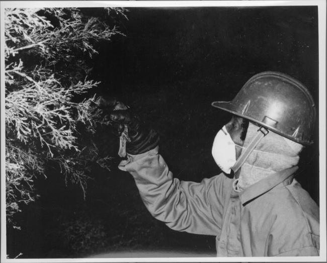 Picking a night-roosting Cowbird from a Cedar tree in Kentucky, in preparation for banding the bird. The mask is to protect the student from inhaling Histoplasma, a species of Fungus (Histoplasmosis is a fungal infection).