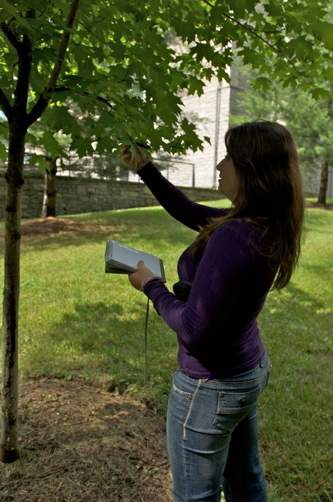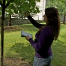Female student with open tree identification book looking at tree leaves to identify species; taken during National Park Service Junior Rangers Ambassador Training workshop.