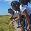 Girls make faces while bending over a marsh to pick up and examine algae at San Diego Bay National Wildlife Refuge.
