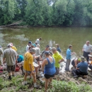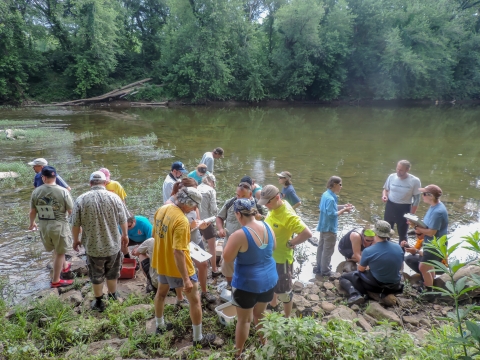 Students examine freshwater mussels on shore in the Cacapon River, WV.