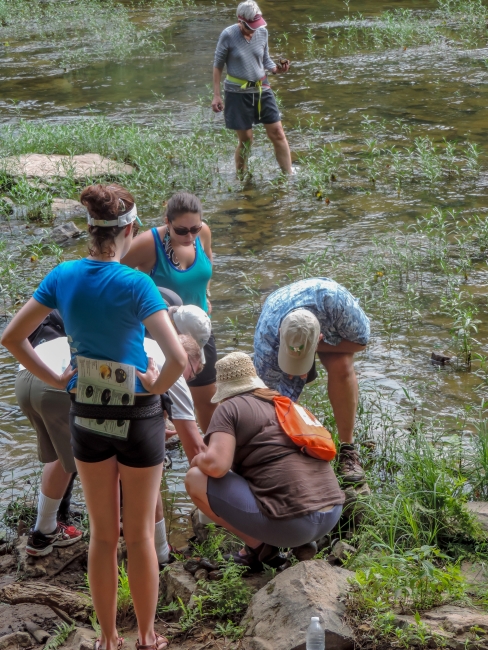 Students examine freshwater mussels on shore in the Cacapon River, WV.