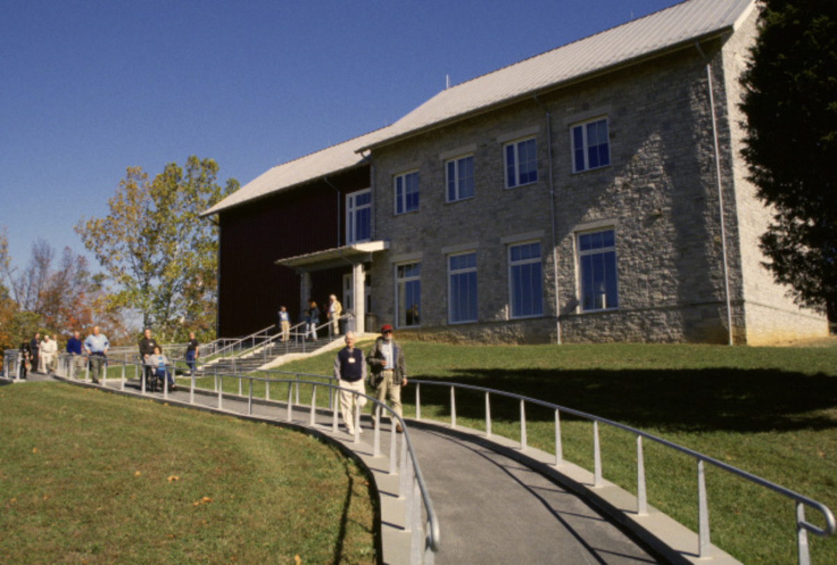 People walking along sidewalk with person in wheelchair in front of Instructional West building on National Conservation Training Center (NCTC).