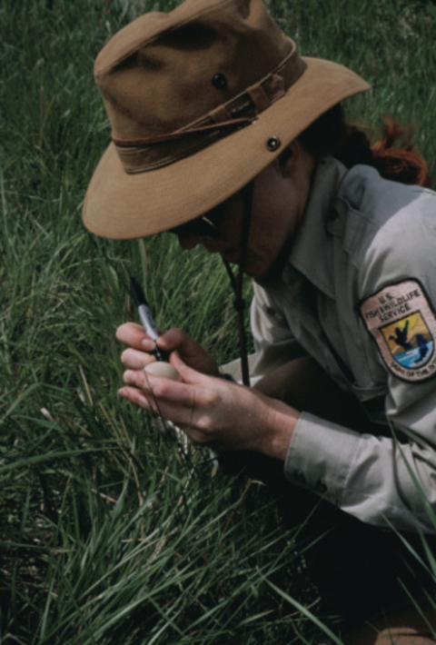 Fish and Wildlife Service biologist studying avocet egg. Vertical.