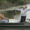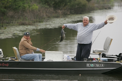 Two older men enjoying fishing from boat; one man is standing and raising hat while showing the fish he just caught.
