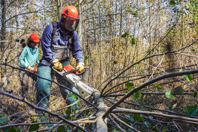 Sue Cameron and Jay Mays, US Fish and Wildlife Service, cut European alder at a Henderson County, NC wetland.
