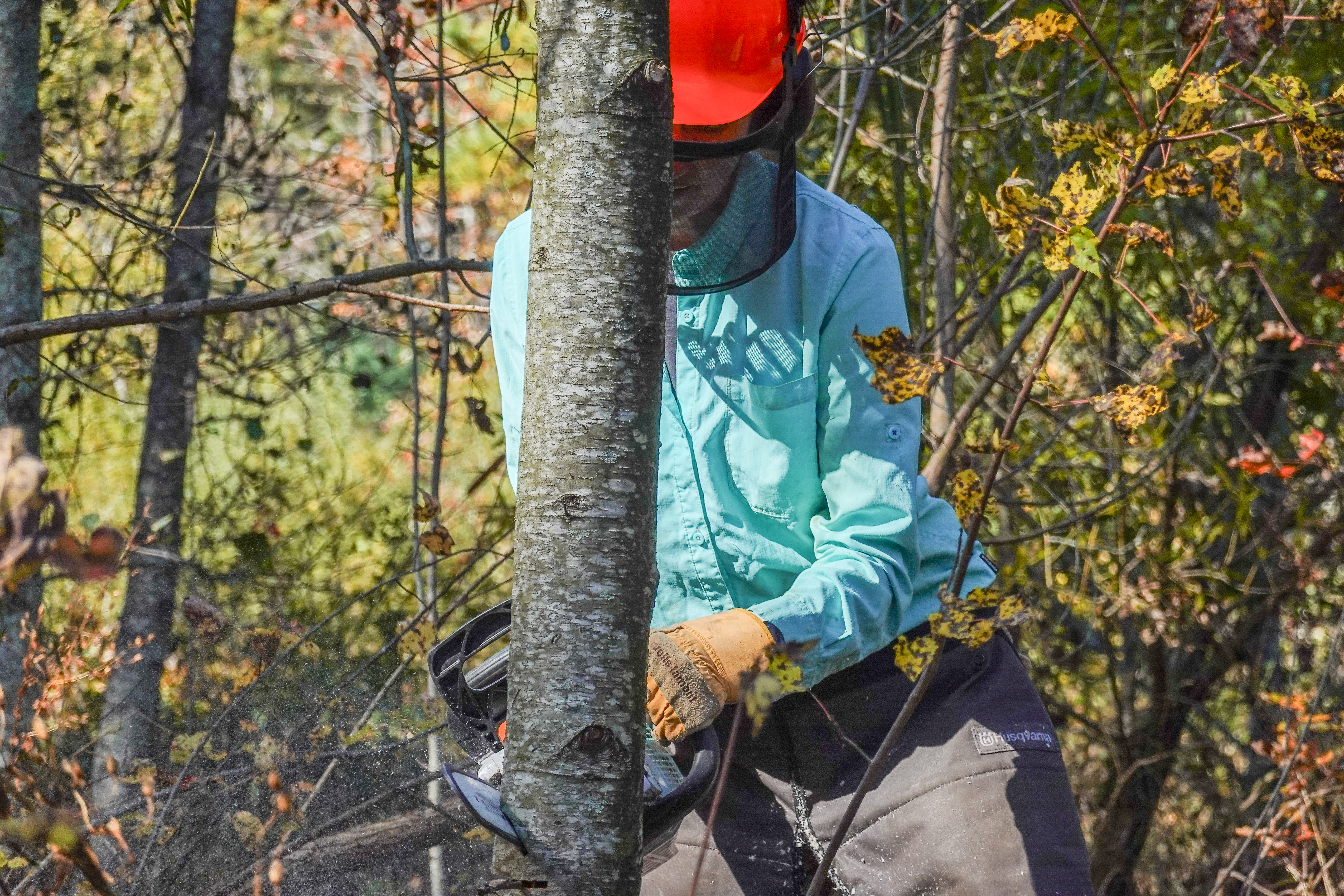Sue Cameron, US Fish and Wildlife Service, cuts a European alder in a Henderson County, NC wetland.