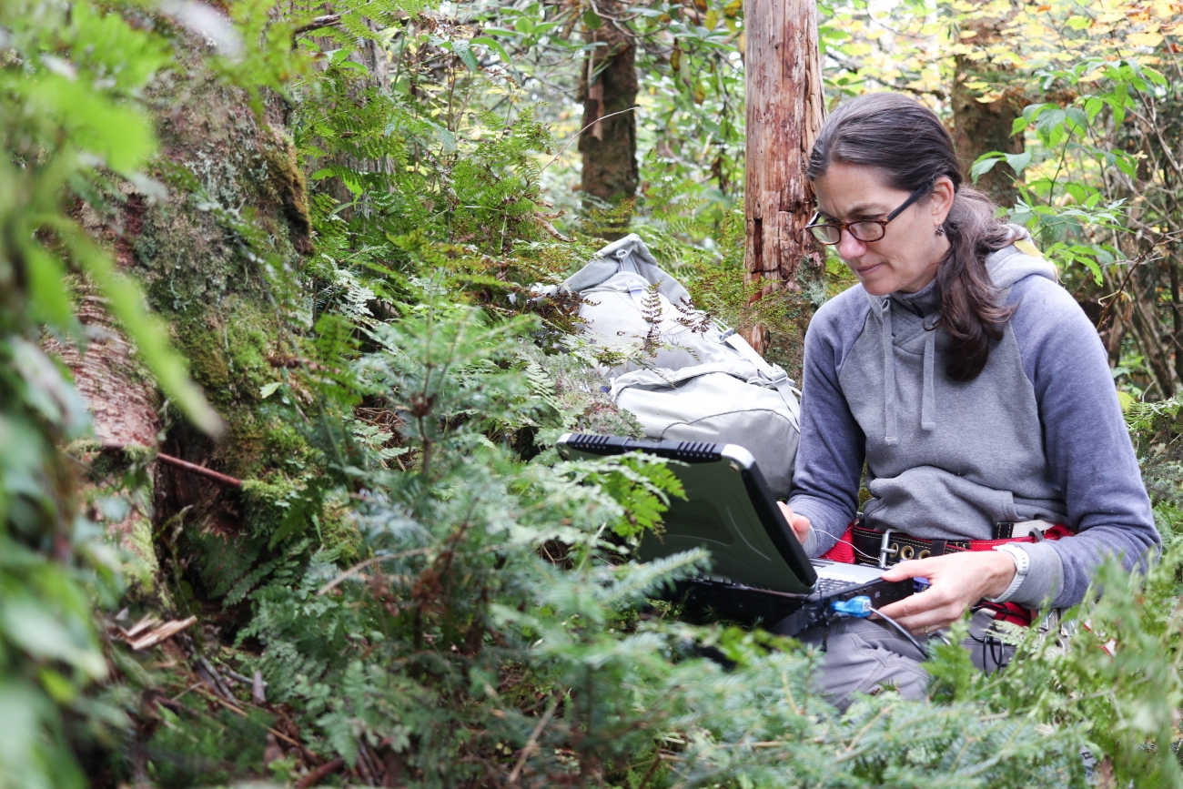 Sue Cameron, U.S. Fish and Wildlife Service, checks her computer while downloading data from field-mounted data loggers in the Black Mountains of North Carolina.
