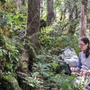 Sue Cameron, U.S. Fish and Wildlife Service, checks her computer while downloading data from field-mounted data loggers in the Black Mountains of North Carolina.