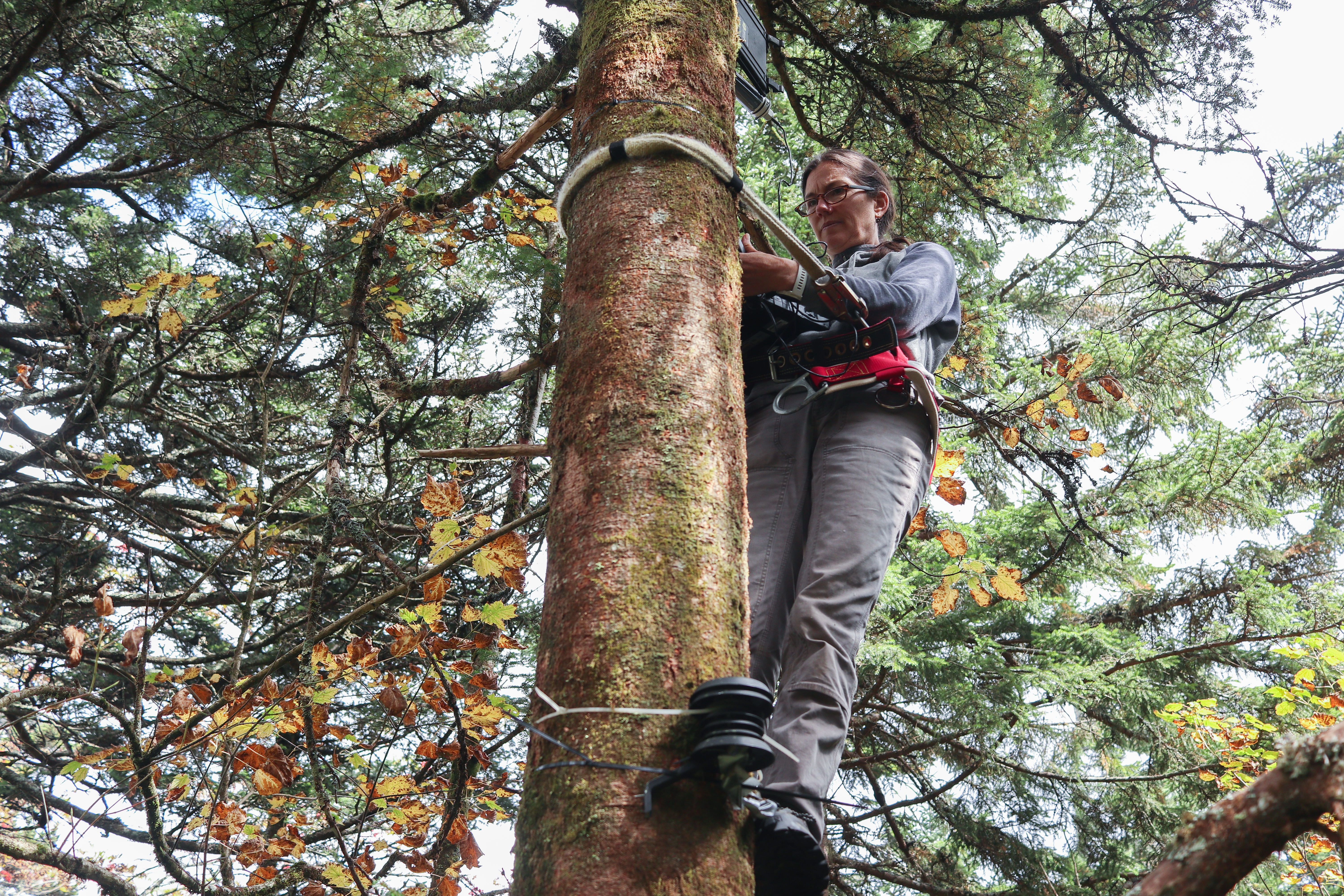 Sue Cameron downloads temperature and humidity data for an automated data logger in North Carolina's Black Mountains. The logger collects the data several times daily, which Cameron downloads twice a year.