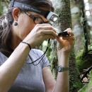 U.S. Fish and Wildlife Service biologist Sue Cameron examines a spruce-fir moss spider on a monitoring trip to Mount Mitchell State Park, Yancey County, NC