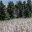 Sue Cameron makes her way through a field of blackberry bushes, marking spots where red spruce trees will be planted.